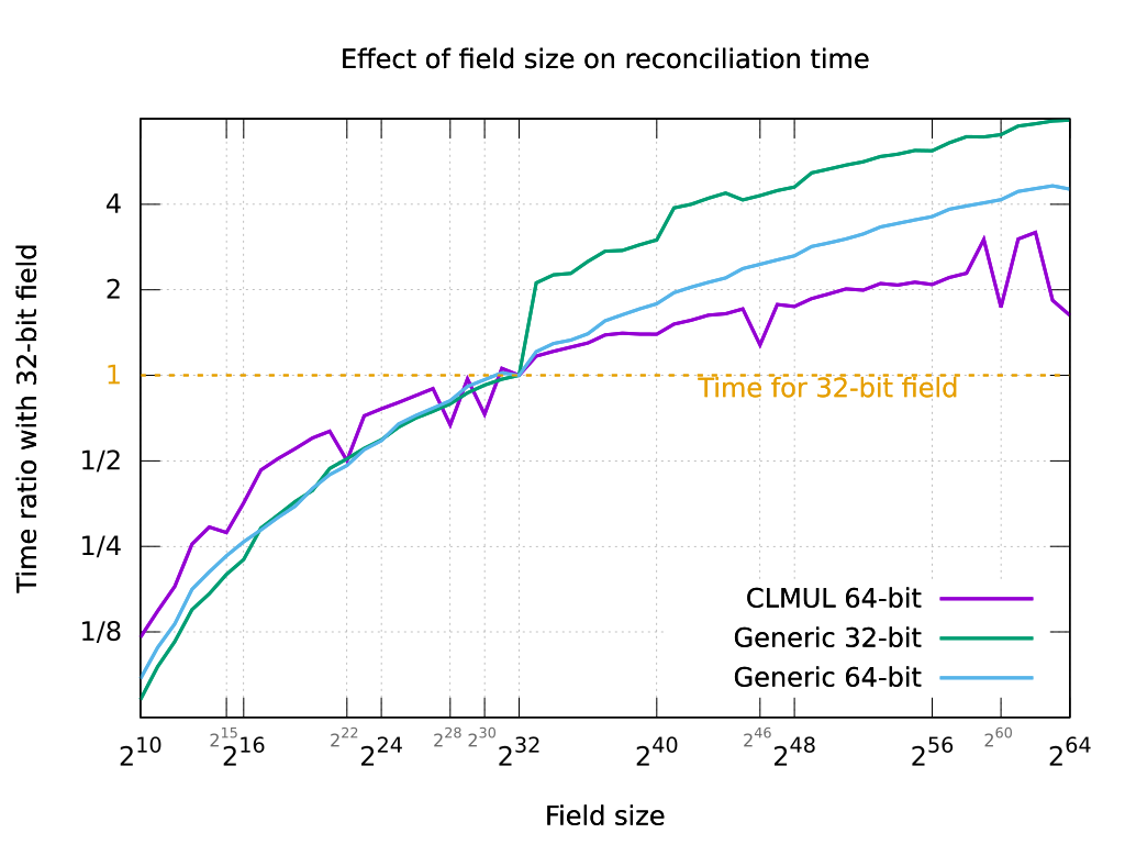 The fourth graph above shows the effect of the field size on speed in libminisketch. The three lines correspond to: