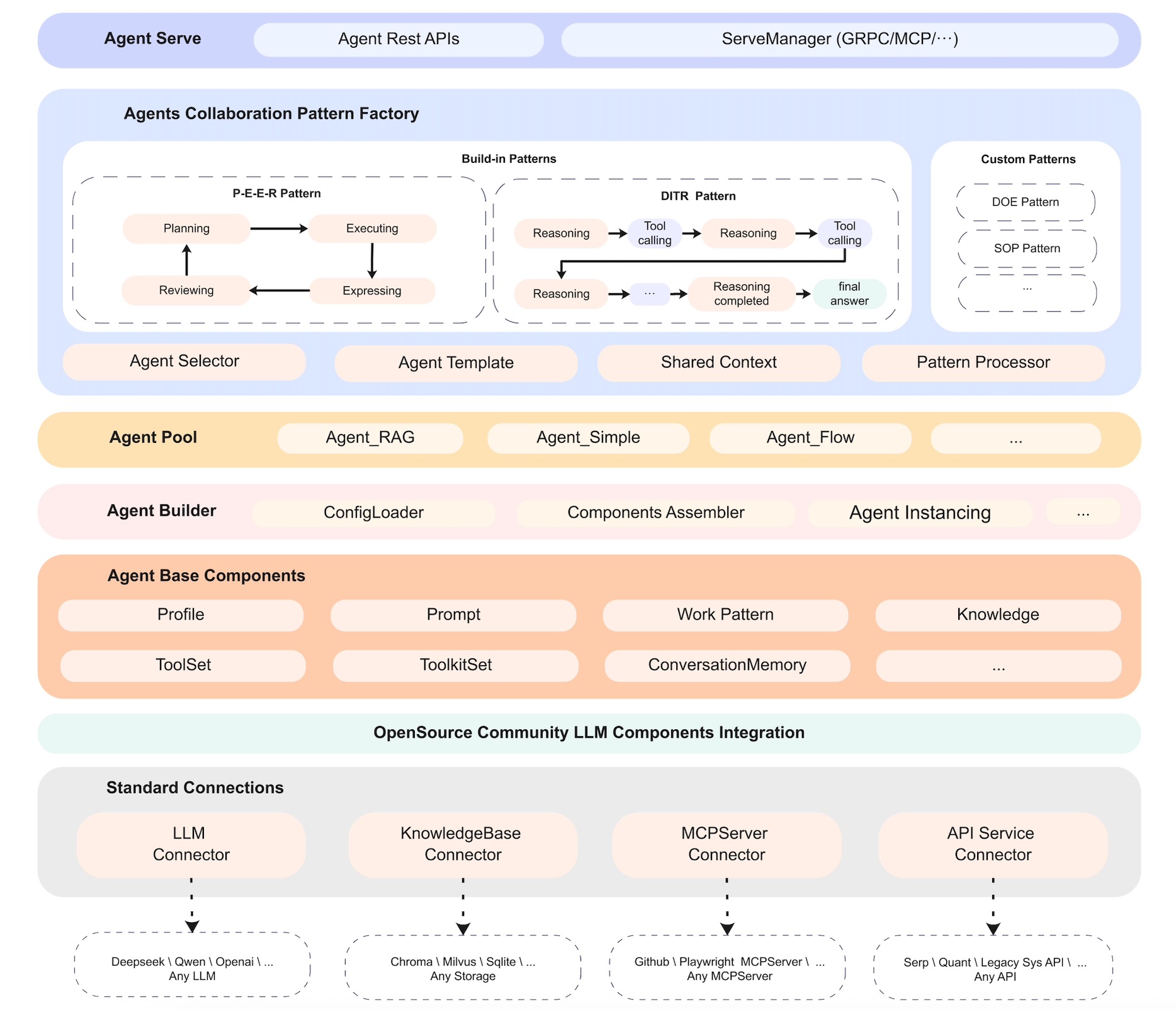 Flexible and Extensible Agent Construction Capability: It provides all the essential components necessary for building agents, all of which support customization to tailor user-specific agents.