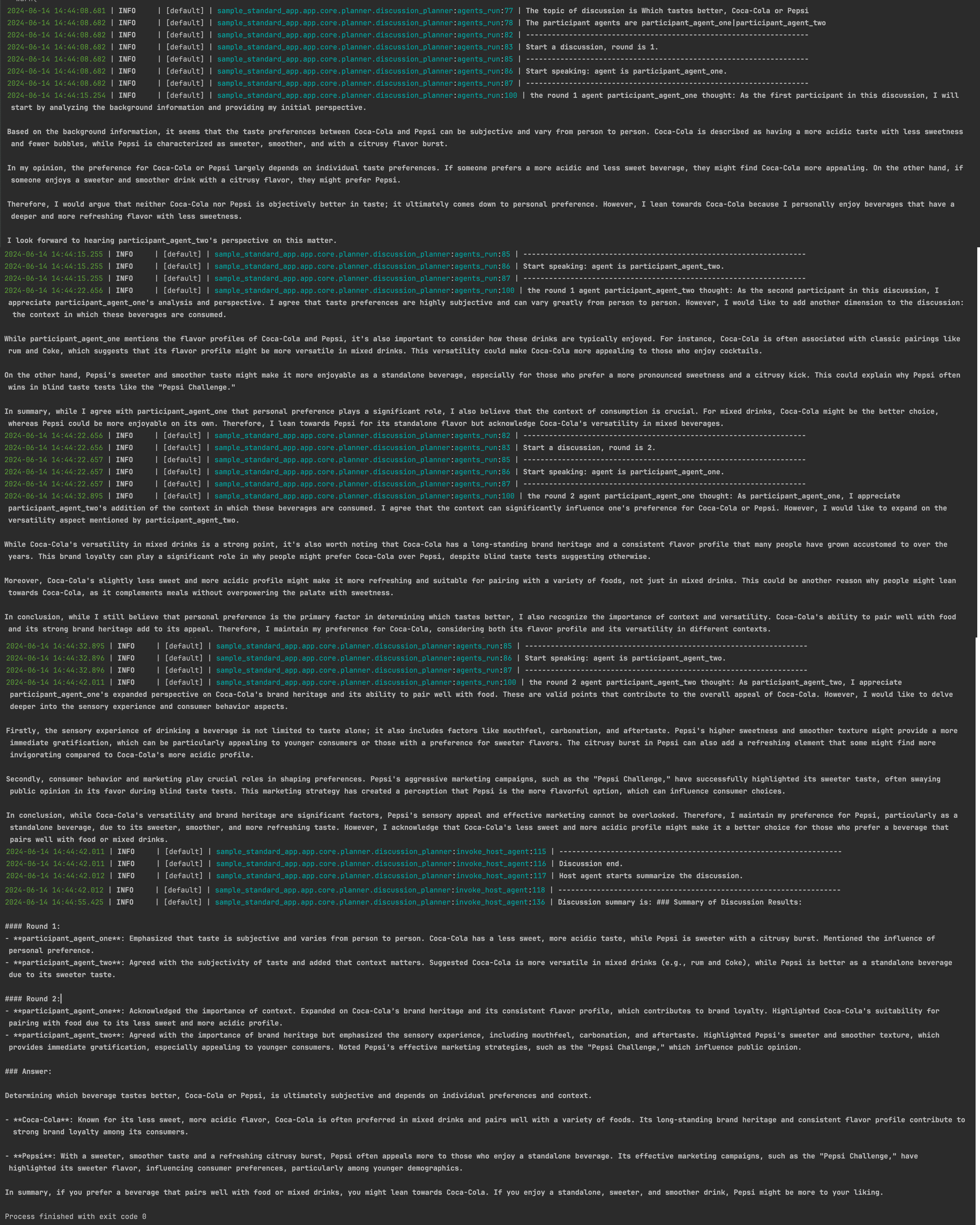 In this use case, we will demonstrate how to utilize agentUniverse for multi-agent discussions. There are two agent roles: the discussion group host (one role) and discussion group participants (multiple roles). The user initiates a discussion topic, and the host organizes the participants to commence the discussion. In each round, each participant expresses his or her own views based on the discussion topic (note that the views of each participant are not static and will be constantly adjusted as the discussion progresses). After several rounds of discussion, the host will summarize the discussion process and present the participants' consolidated results back to the user. Many minds are better than one. Imagine having a question you wish to answer and submitting it directly to an agentUniverse discussion group, The host will assemble multiple agents with diverse perspectives, focus on your question, and ultimately provide you a comprehensive and intelligent response, which is an interesting agent experiment.